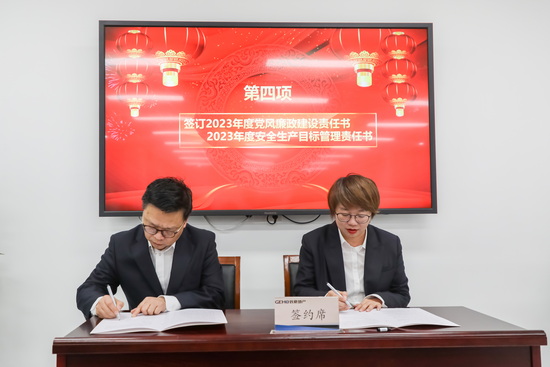 為(wèi)及早部署今年(nián)重點工(gōng)作(zuò),明(míng)确發展目标,壓實各方責任,總經理(lǐ)呂建中與經營層成員(yuán)、部門(mén)負責人(rén)≠、項目經理(lǐ)簽訂了(le)2023年(nián)度績效目标任務責任書(shū);為(wèi)加強黨風(fēng)廉政建設和(hé)安全管理(lǐ)責任落實,支部書(shū)記、董事(shì)長×(cháng)馮惇與經營層成員(yuán)、部門(mén)負責人(rén)簽訂了(le)2023年(nián)度黨風(fēng€)廉政建設、安全生(shēng)産目标管理(lǐ)責任書(shū)。